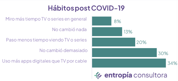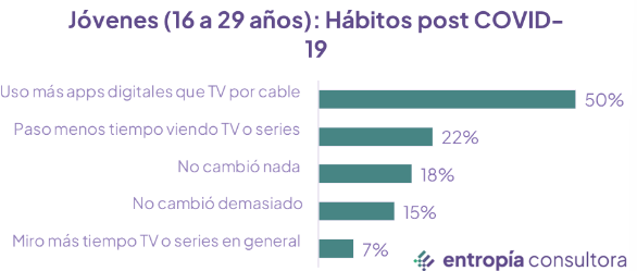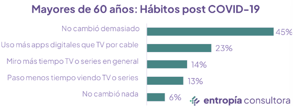 En cuanto a las tendencias al cambio, si se analiza el cambio de hábitos en jóvenes (menores de 30 años), la principal diferencia respecto al promedio es el nivel de adopción de uso de Apps Digitales (50% vs. 34% del general) y en adultos mayores (mayores de 60 años) el aumento del consumo de TV por Cable en formato tradicional, aumentando la brecha etaria en la modalidad de consumo (Ver figura 9 y 10).
