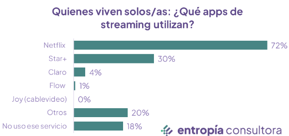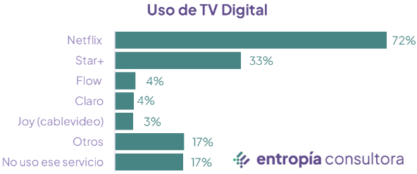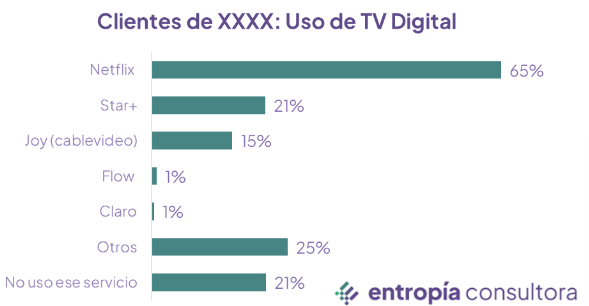 Para continuar, se identificó qué proporción de usuarios usa actualmente aplicaciones digitales de Streaming y la distribución de la misma, tanto para el público general (Ver figura 3) como para los usuarios particularmente de XXXX (Ver figura 4), notando que solo un 15% de los clientes usan la app de la empresa, aspecto con potencial a crecer, y notando además un consumo levemente menor de apps de Streaming on-demand como Netflix, Star+ y otras.