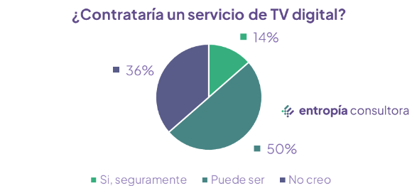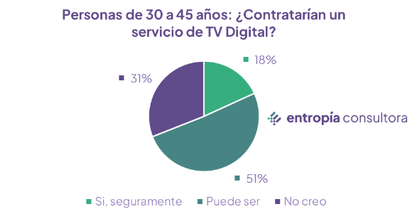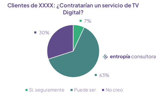 Por otro lado, se analiza la potencialidad de contratación de servicio de Streaming de TV a futuro entre el público general y los clientes de XXXX. Si bien aparece menor proporción de convencimiento entre los clientes de XXXX(7% vs 14%), si se suman los convencidos con los que responden “puede ser”, suman un 70% vs un 64% del público general, lo que indica cierta potencialidad en el servicio (Ver figura 6 y 7).