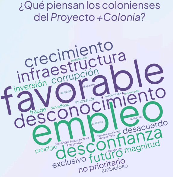 En nuestra investigación cualitativa, preguntamos a los colonienses qué piensan en general sobre el proyecto "+Colonia". Los conceptos más destacados entre las respuestas positivas fueron "empleo", "favorable", "crecimiento" e "infraestructura", indicando que muchos ven el proyecto como una oportunidad para el desarrollo económico y la mejora de la ciudad.